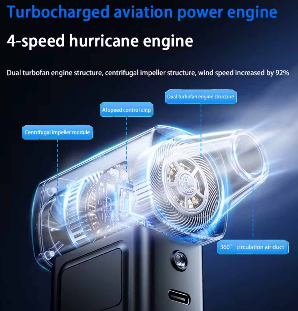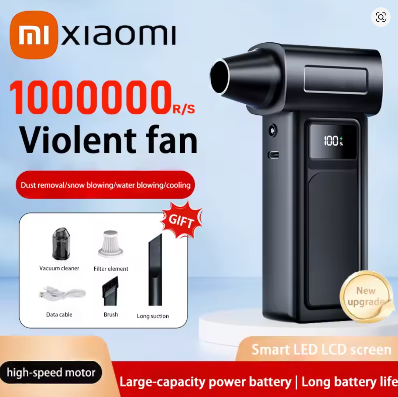 The 1,000,000 RPM Turbo Jet Blower is a portable electric air cleaner with a high-speed brushless motor. It produces a wind speed up to 65 m/s, equivalent to a 17-level typhoon, making it perfect for dust cleaning, pet drying, air cushion blowing, and other applications. Compact, lightweight, and wireless, it’s designed for both home and professional use.